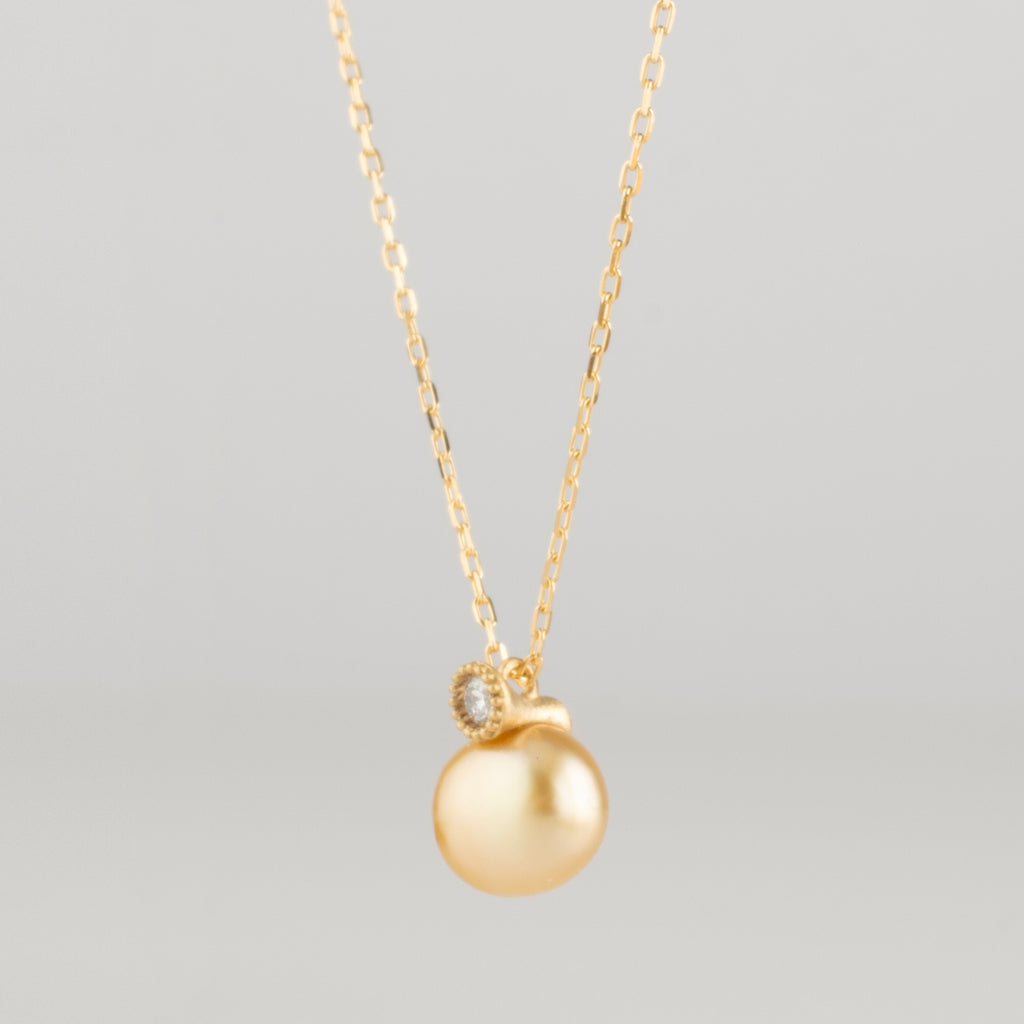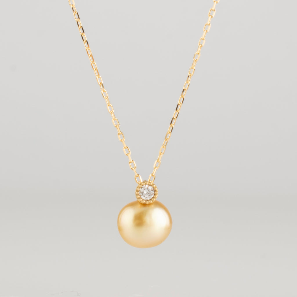 ゴールドに輝く南洋真珠に、ダイヤモンドの煌めきを。小さなサイズながら内側から醸し出す柔らかくも気品のあるゴールドの輝きは、身につける人の首元で豊かな表情を見せてくれます。shinkaiならではの存在感のあるパールジュエリーをお楽しみください。