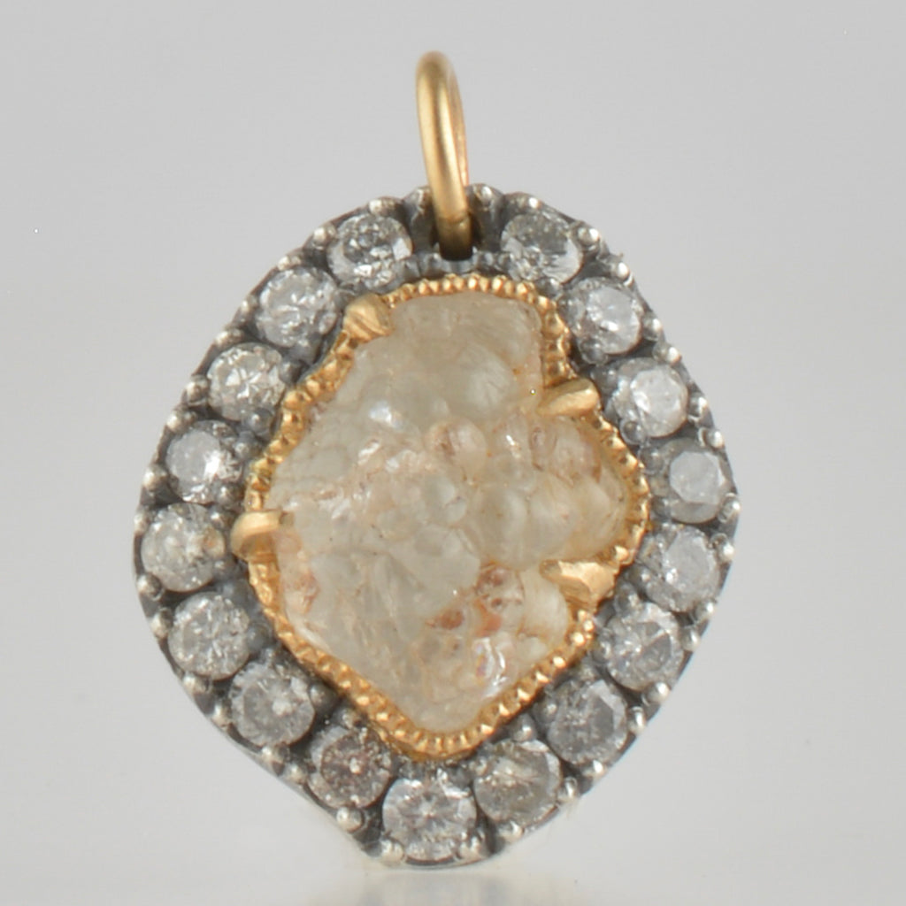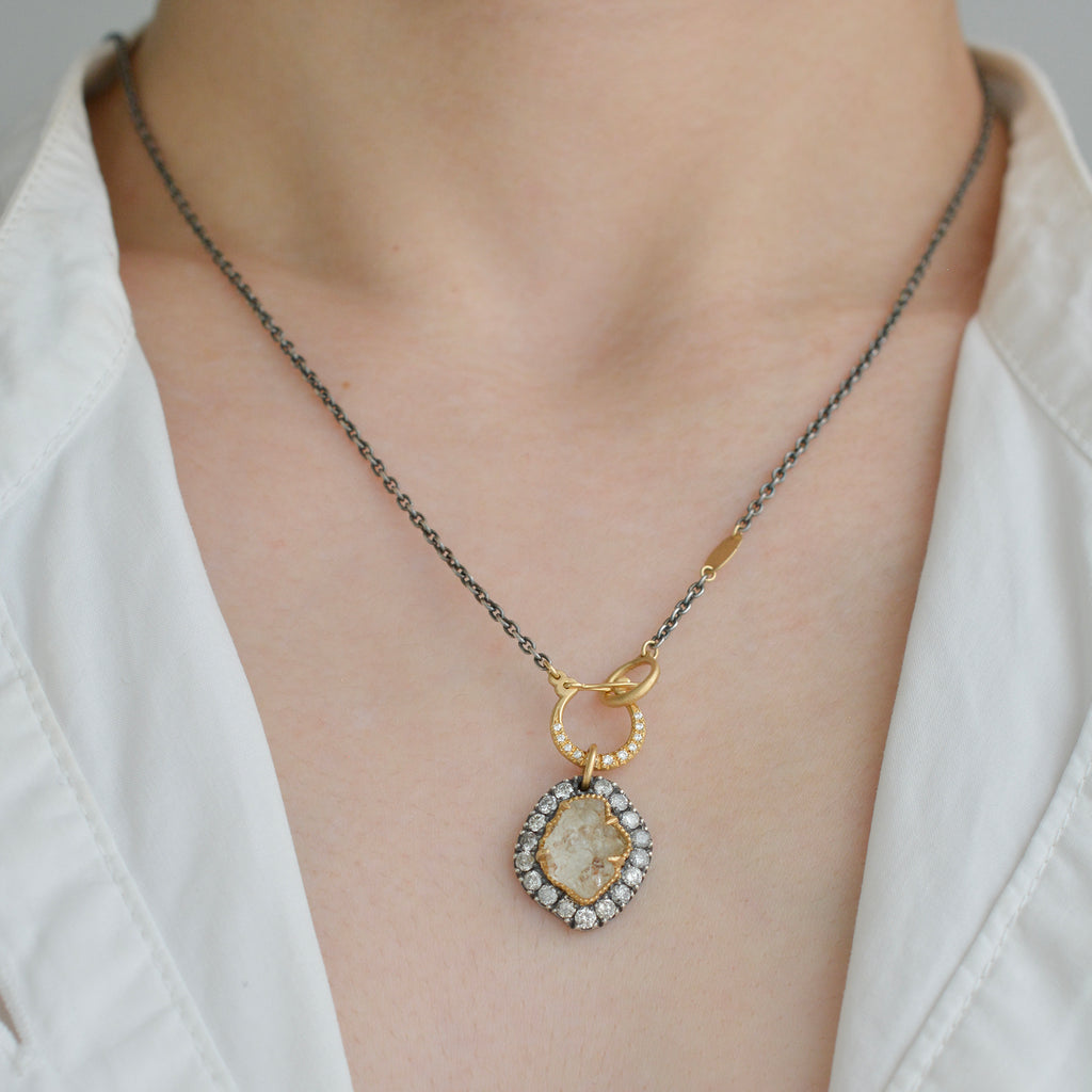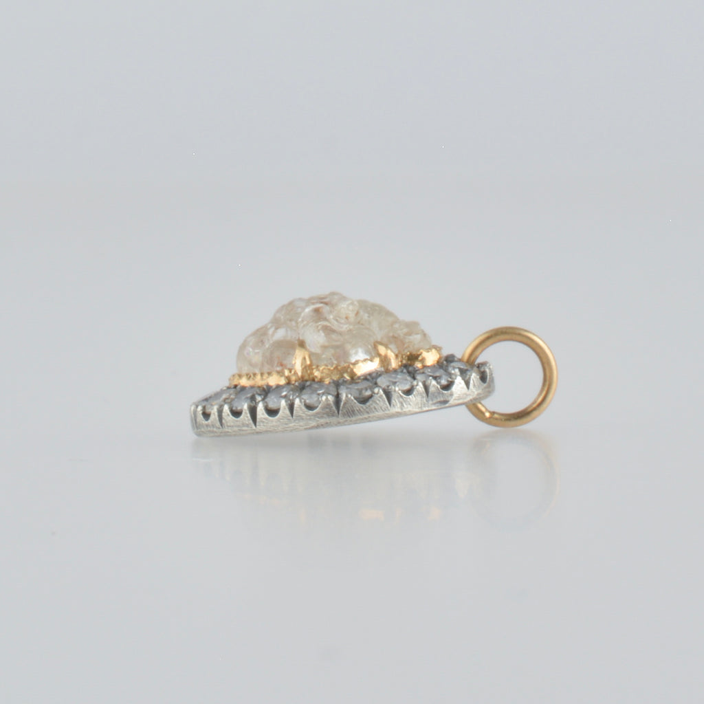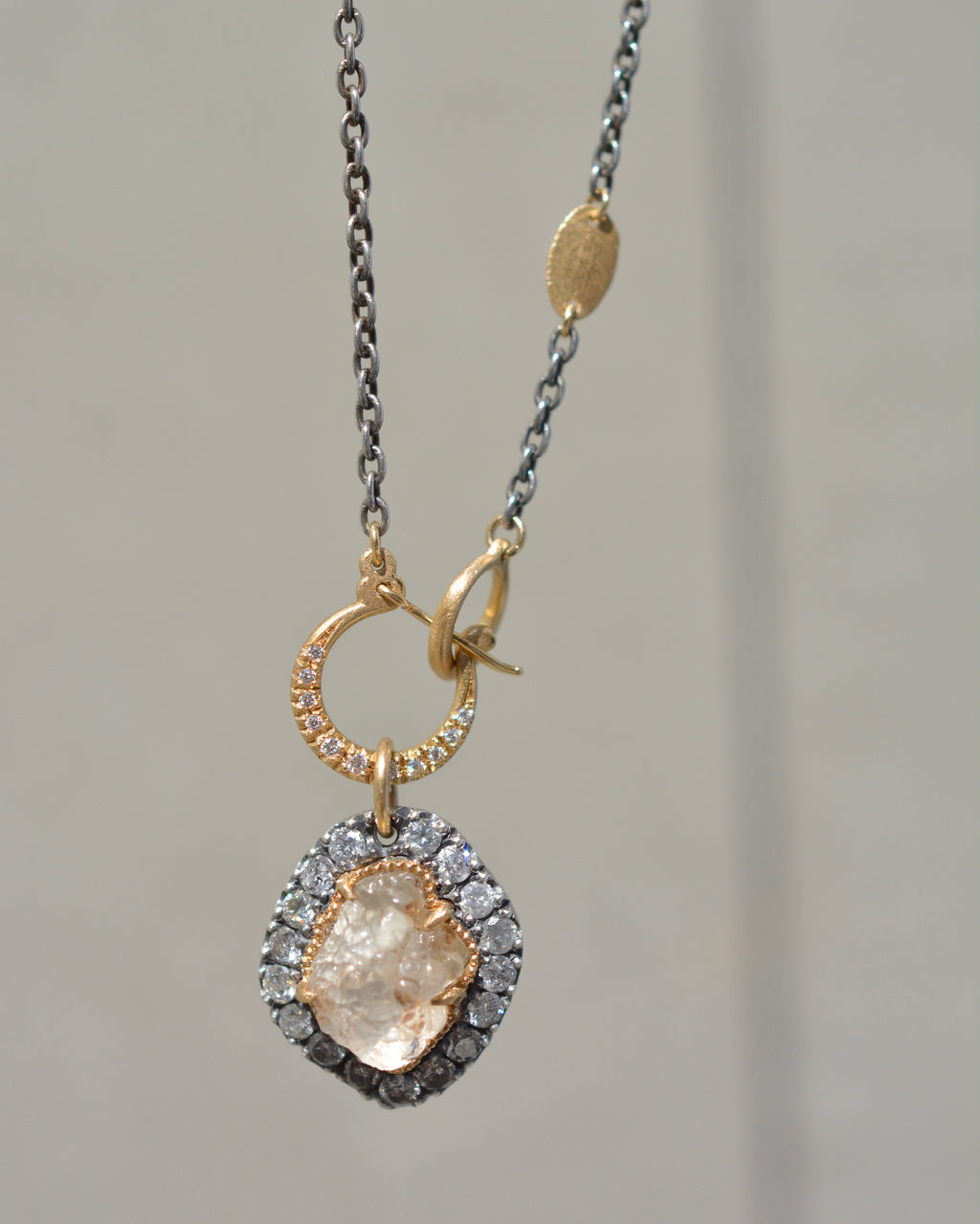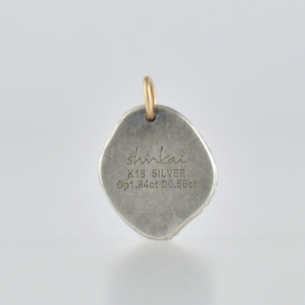 雫が結晶したようなハイアライトオパールの不規則なフォルムに沿ってゴールドのミルグレインを。さらにダイヤモンドをセッティングしたシルバーで縁取ることで、素材のコントラストが印象的なペンダントトップになりました。大胆なデザインと繊細な職人の手仕事が響き合うshinkaiならではのジュエリーです。