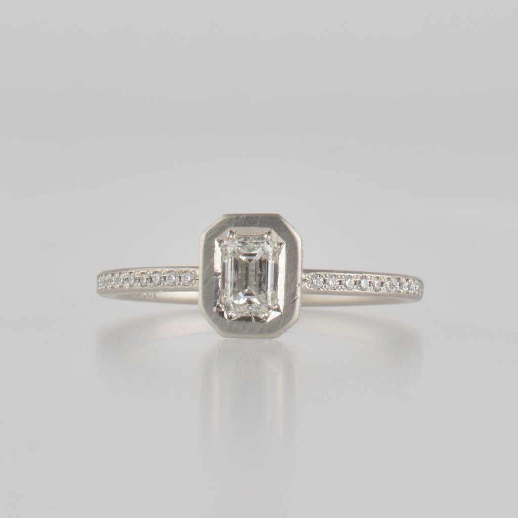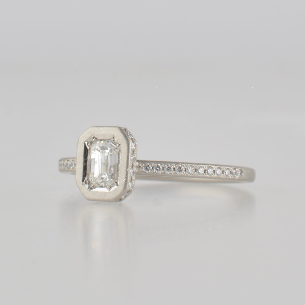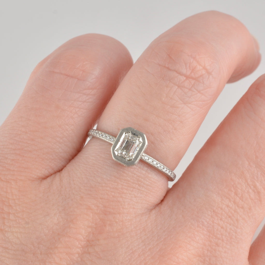 腕と側面には贅沢にメレダイヤをセッティングし、横顔も美しく仕上げました。毎日身につけて一緒に日々を重ねられるダイヤモンドリングは、気取らないエンゲージにもお勧めです。