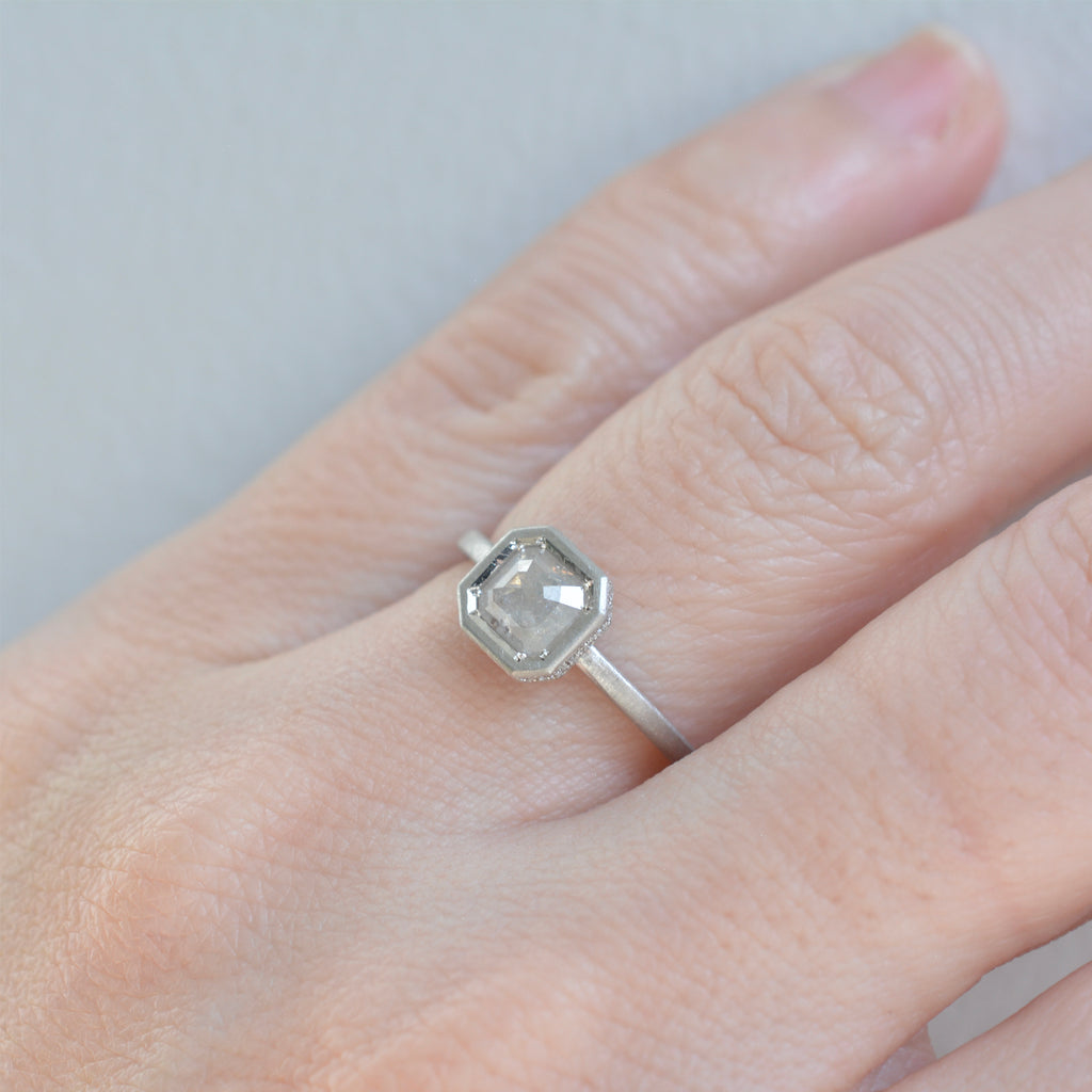 側面には贅沢にメレダイヤをセッティングし、横顔も美しく仕上げました。毎日身につけて一緒に日々を重ねられるダイヤモンドリングは、気取らないエンゲージにもお勧めです。