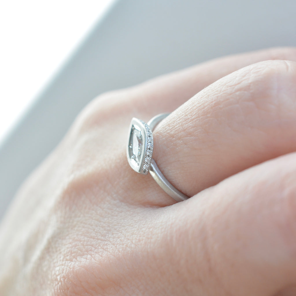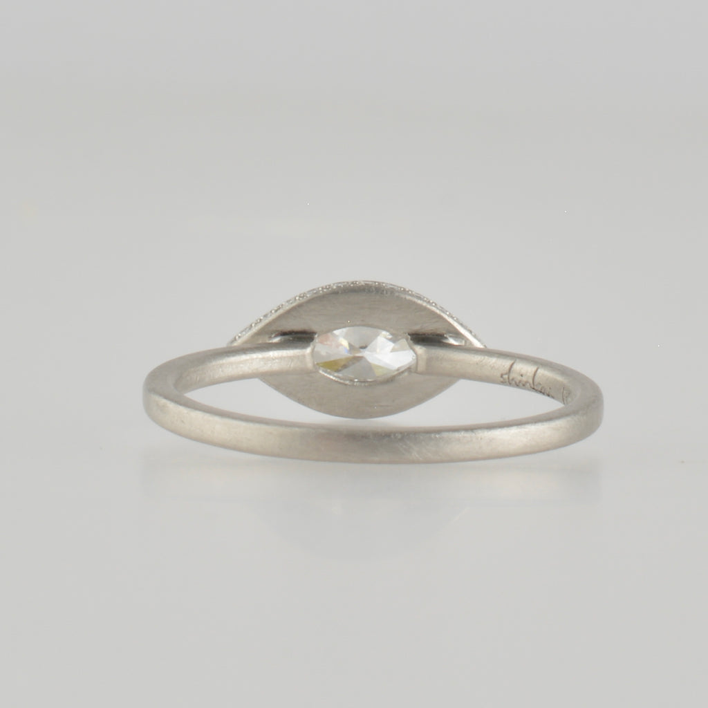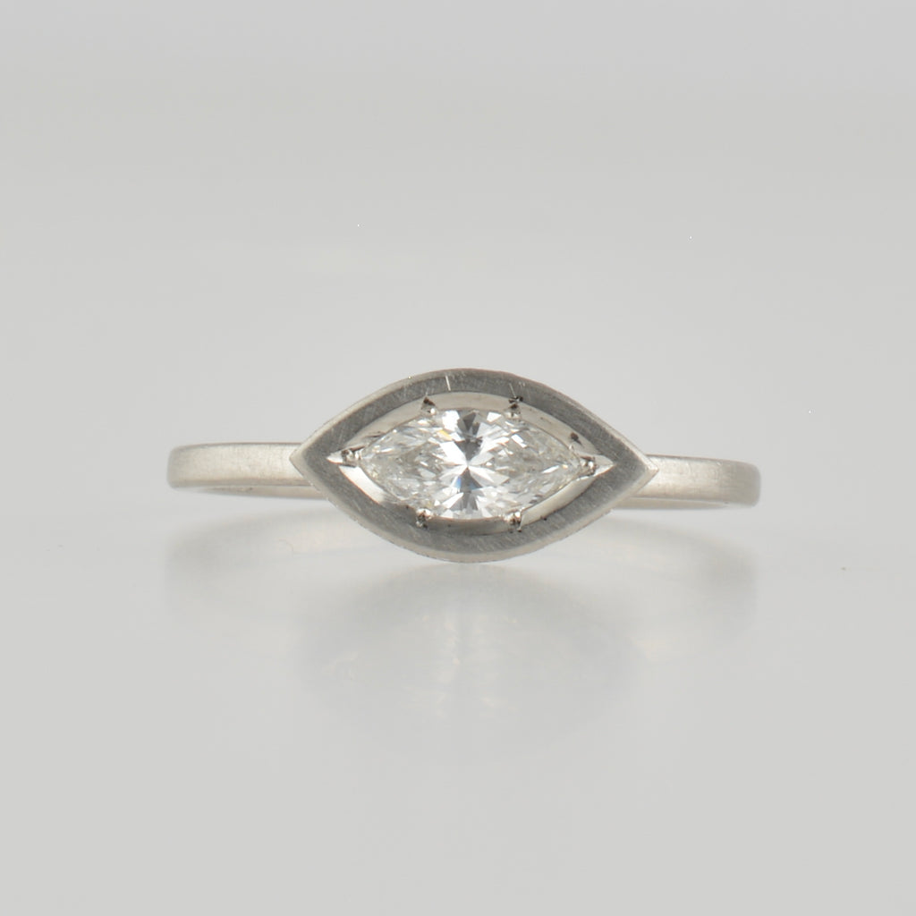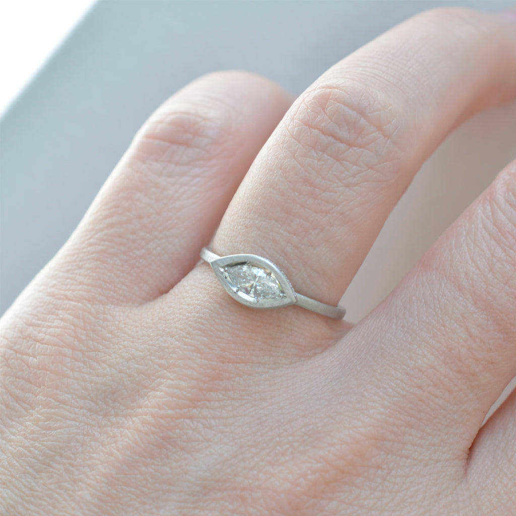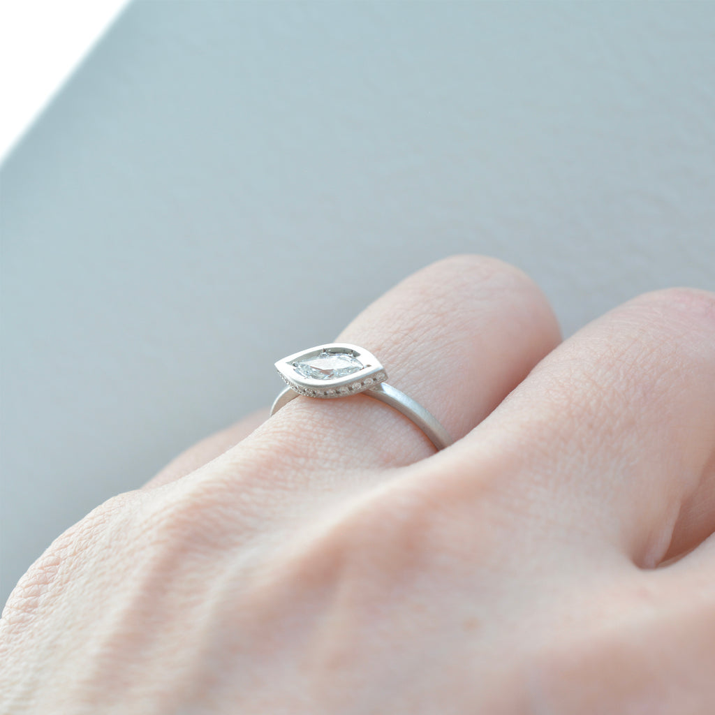 中央には印象的なマーキスカットのダイヤモンドを潔く。側面には贅沢にメレダイヤをセッティングし、横顔も美しく仕上げました。毎日身につけて一緒に日々を重ねられるダイヤモンドリングは、気取らないエンゲージにもお勧めです。
