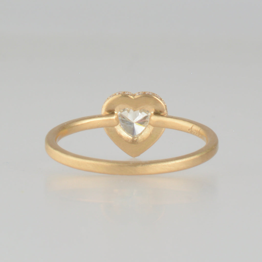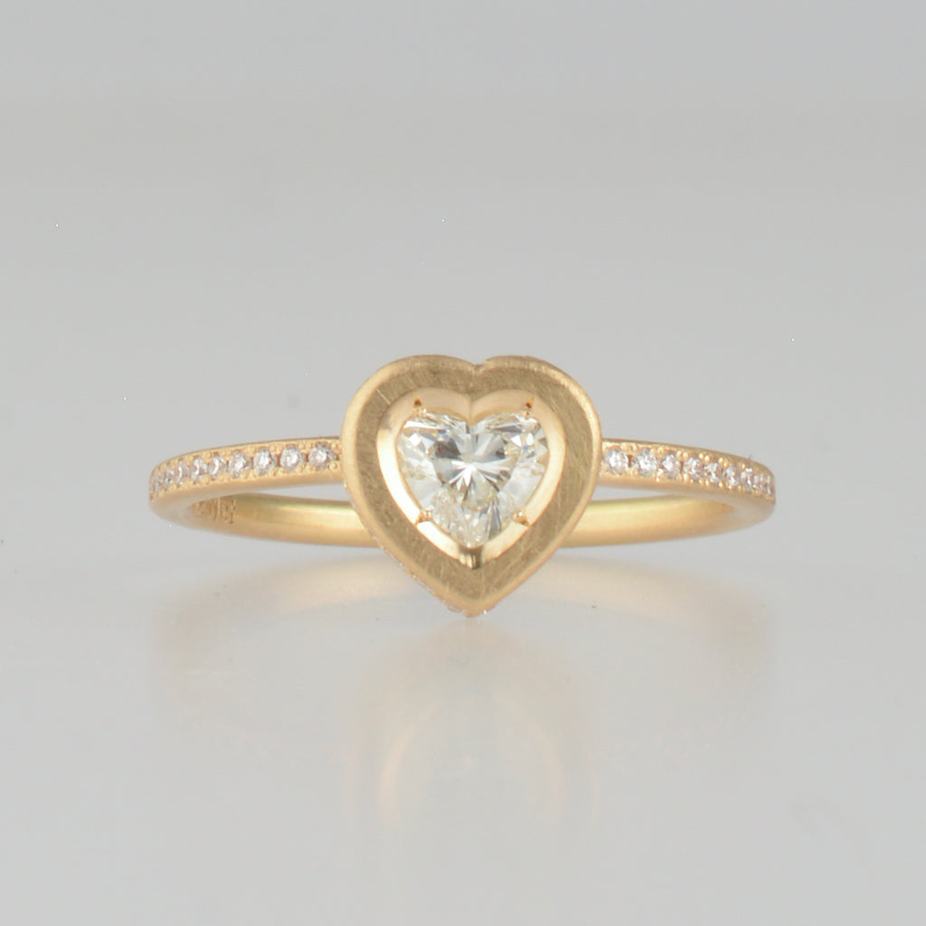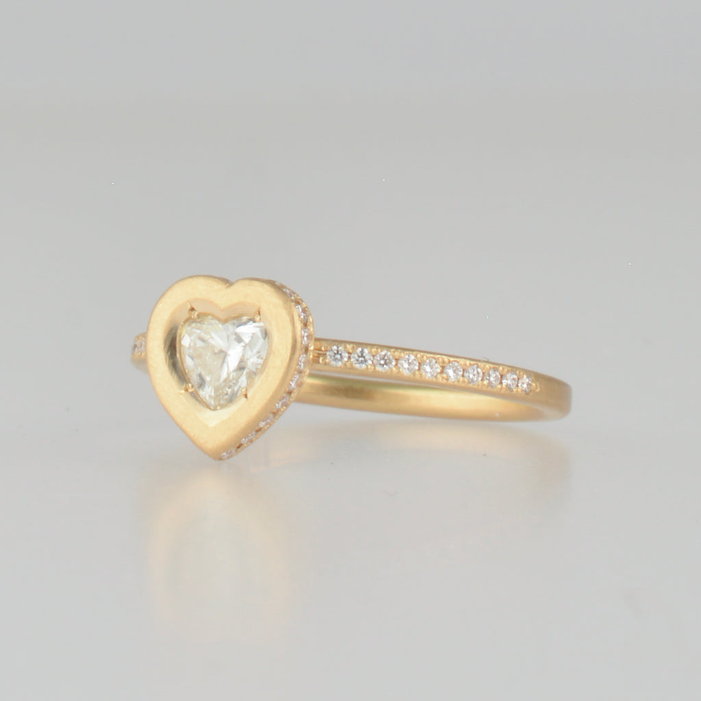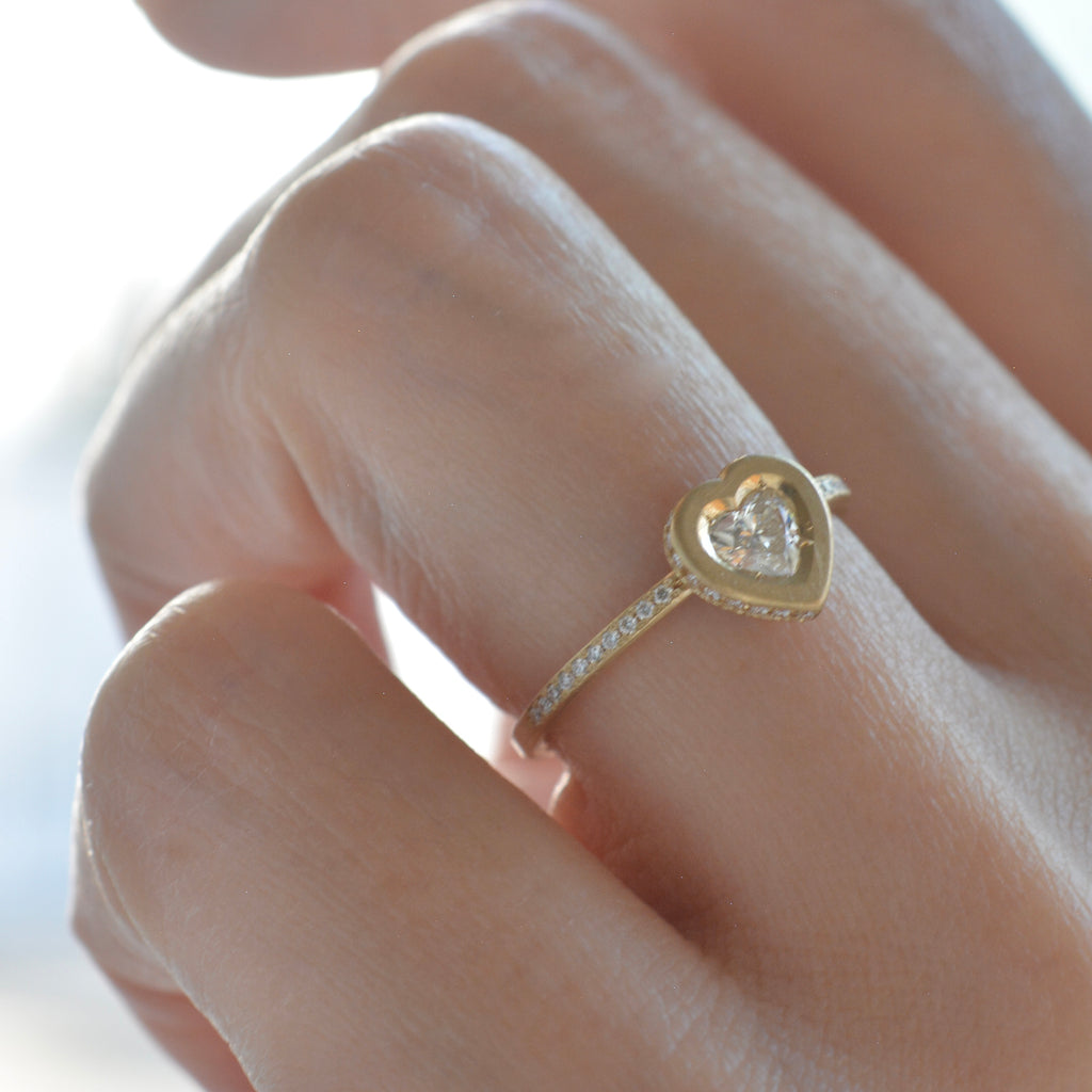腕と側面には贅沢にメレダイヤをセッティングし、横顔も美しく仕上げました。毎日身につけて一緒に日々を重ねられるダイヤモンドリングは、気取らないエンゲージにもお勧めです。