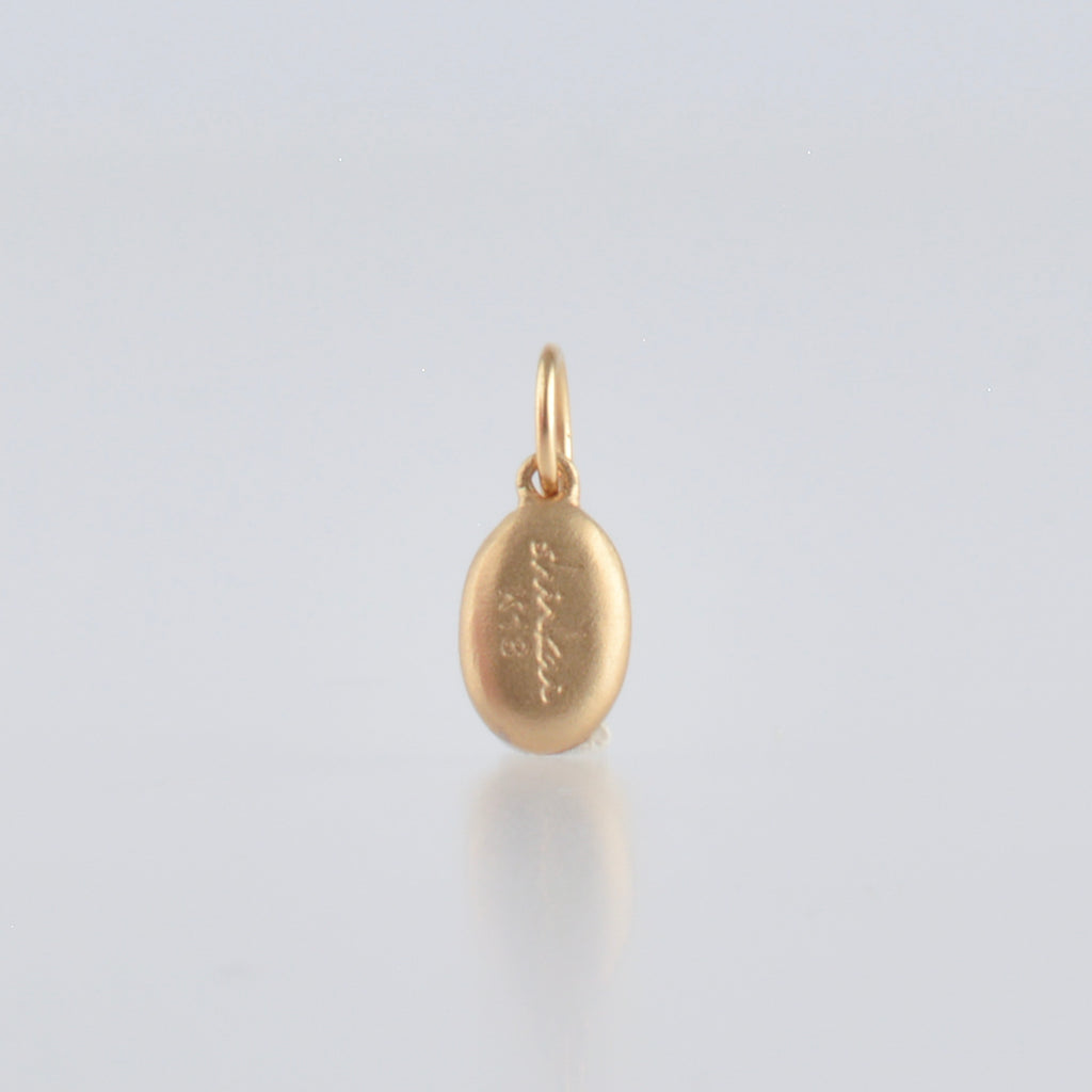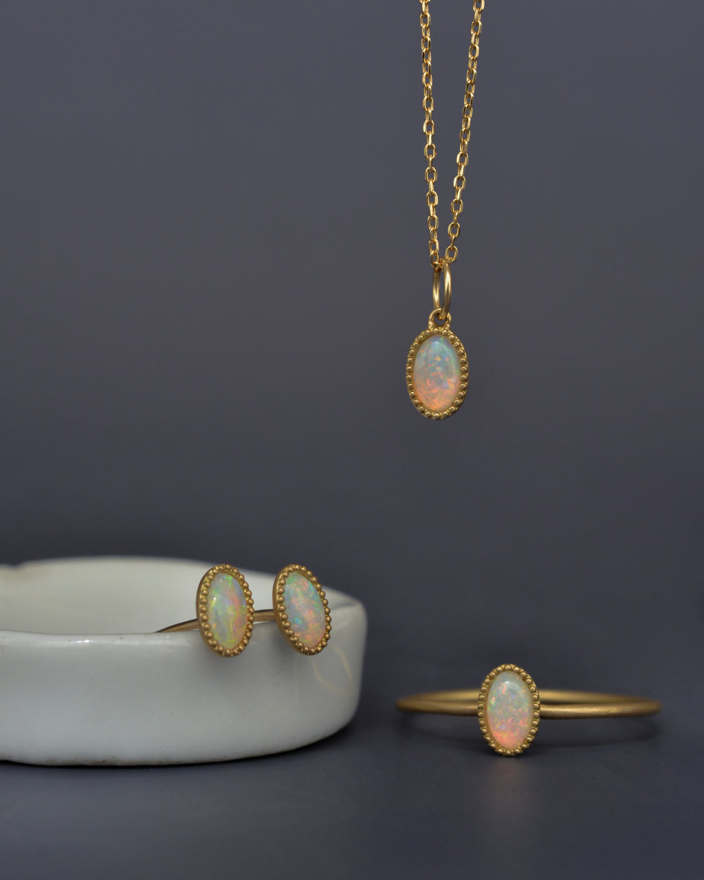淡くきらめく夢のような遊色をたたえたオーバルカットのオパールを、マットゴールドのミルグレインで縁取ったシンプルなペンダントトップ。