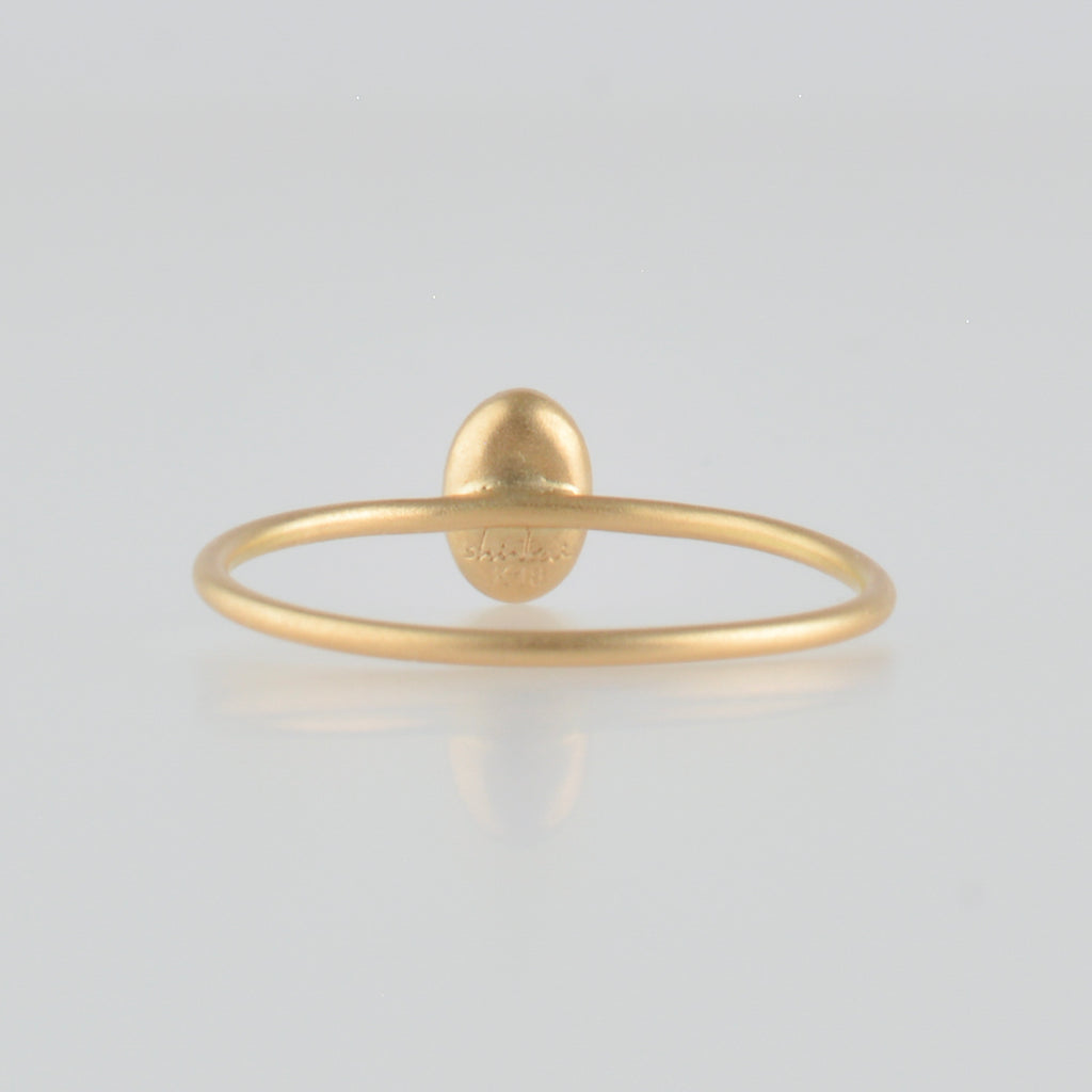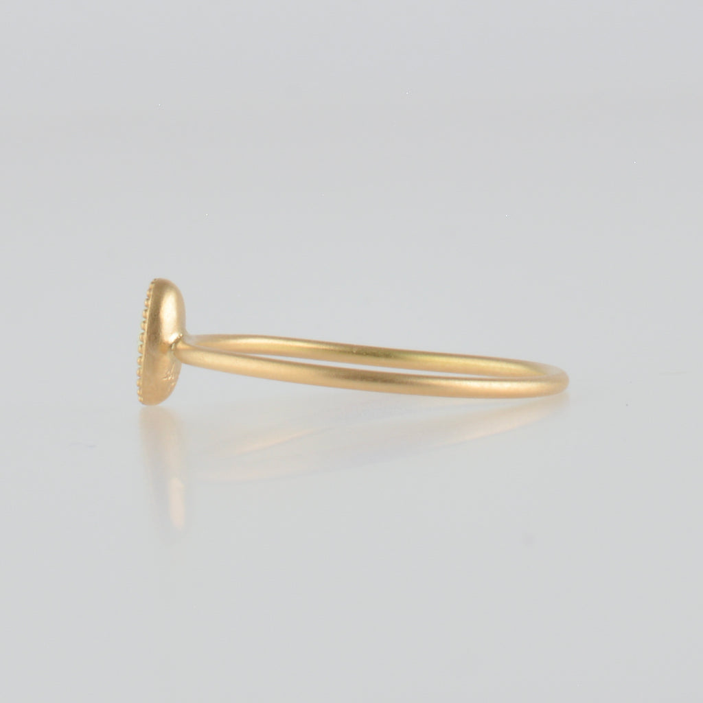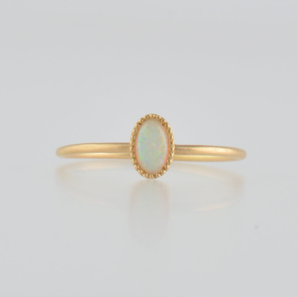 淡くきらめく夢のような遊色をたたえたオーバルカットのオパールを、マットゴールドのミルグレインで縁取ったシンプルなリング。