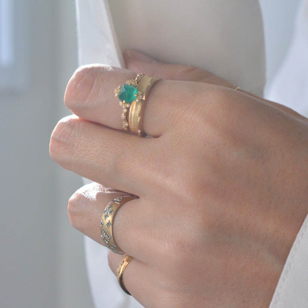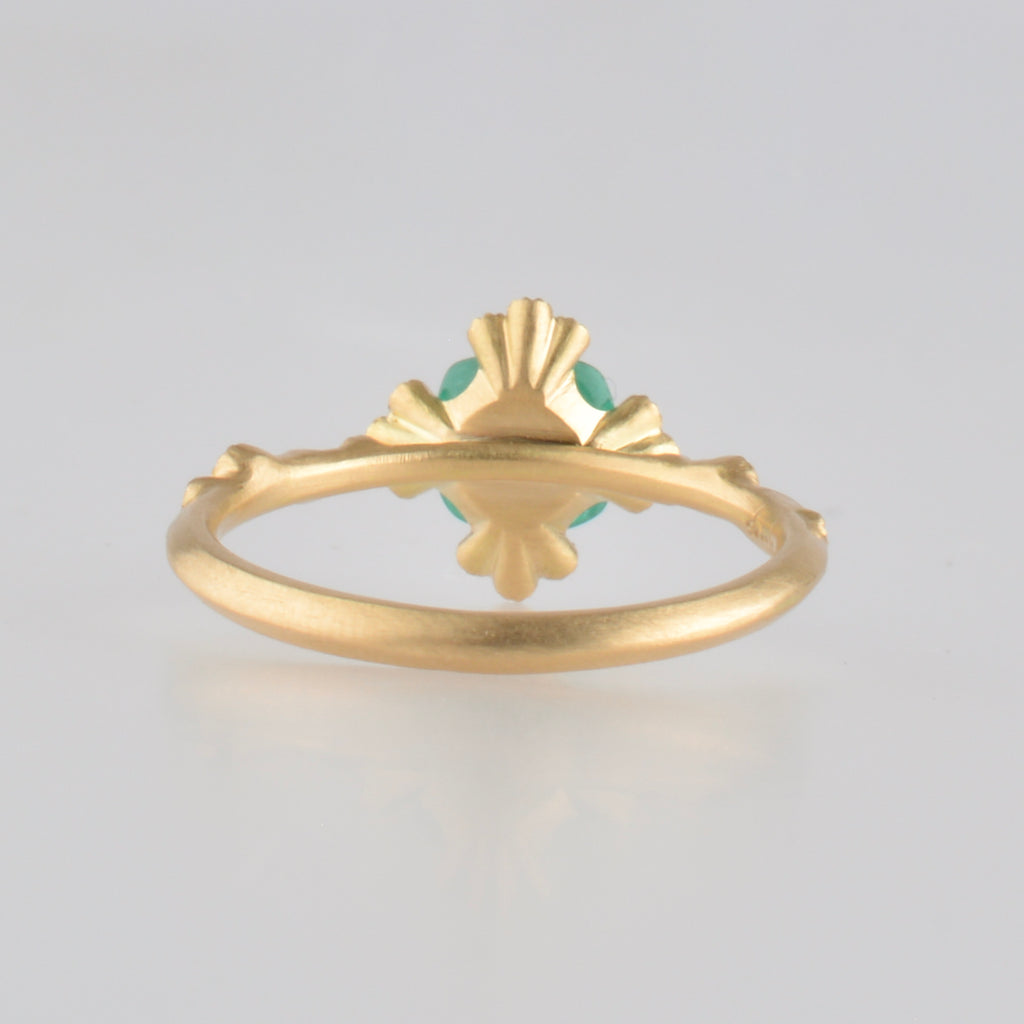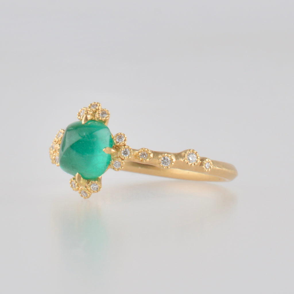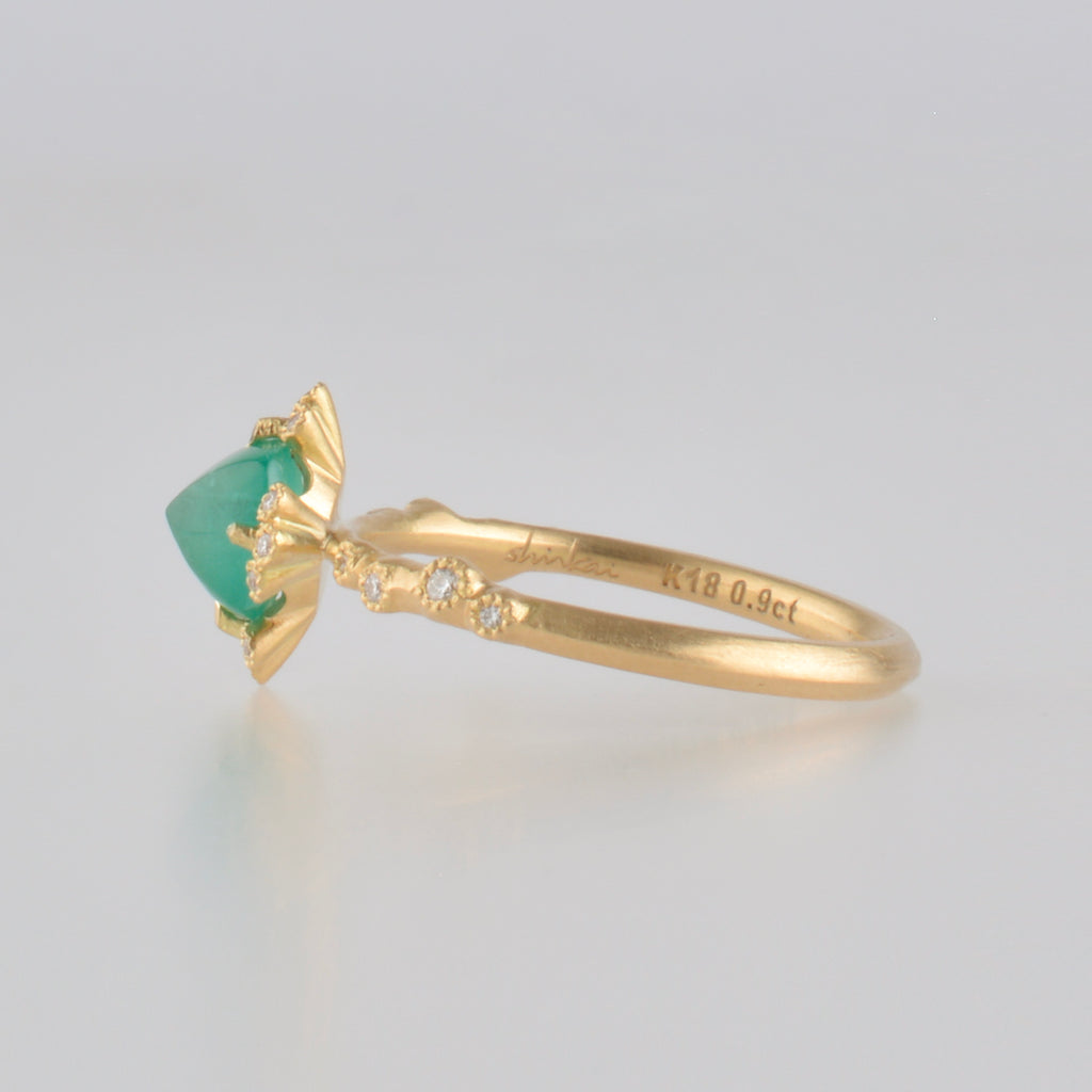 鮮やかなグリーンが印象的なシュガーローフカットのエメラルドをダイヤモンドで繊細に縁取り、きらめきを添えたリング。shinkaiならではの可憐さと品格を合わせもつジュエリーです。